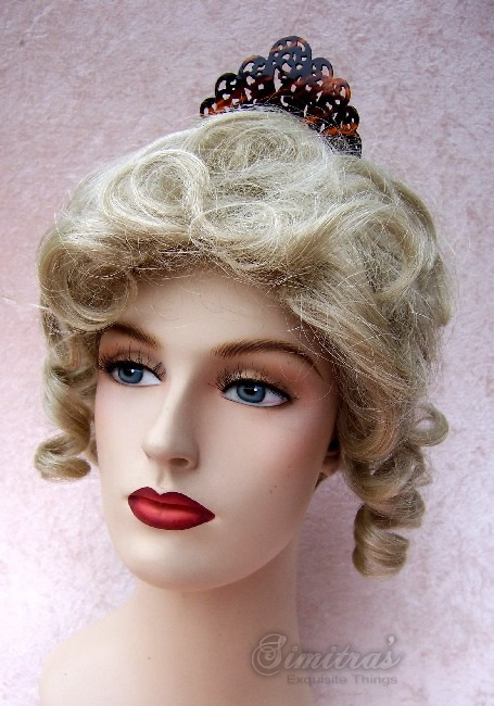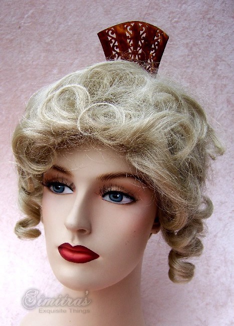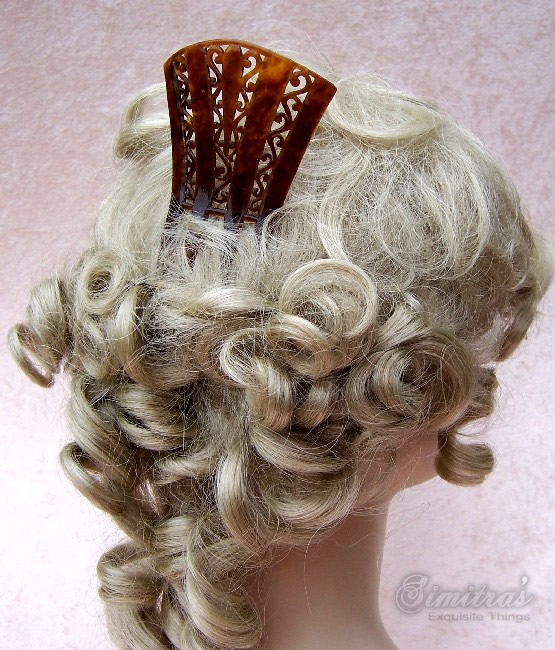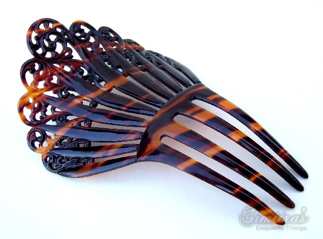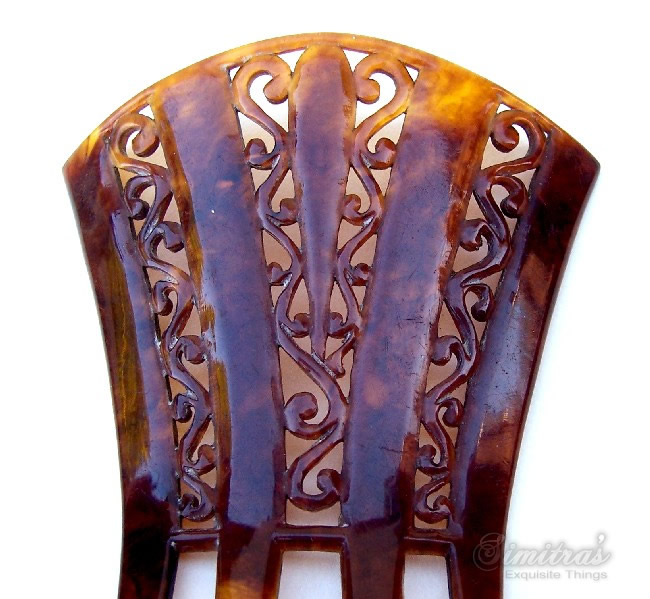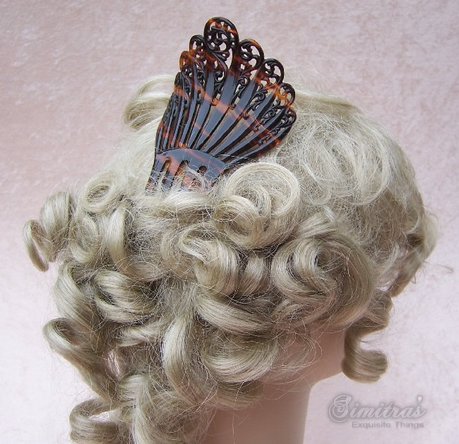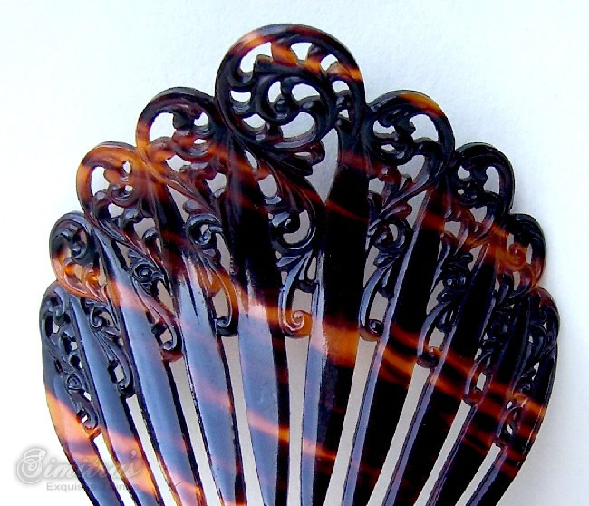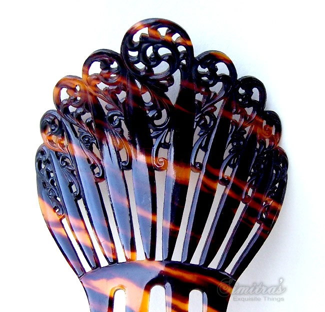 By the late 19th century genuine tortoiseshell had become an expensive luxury material and was widely imitated by celluloid faux tortoise effects. Picture 6 is from a contemporary photograph and show how large mantilla combs like this were worn standing proud of the head.