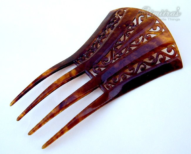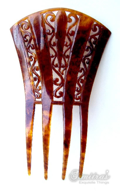 Such combs became very popular from the 1870s with the opening of the opera Carmen. They remained in fashion well into the 20th century. This one has an openwork design with solid panels alternative with those featuring open scrollwork.