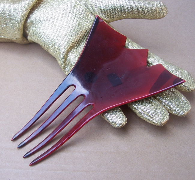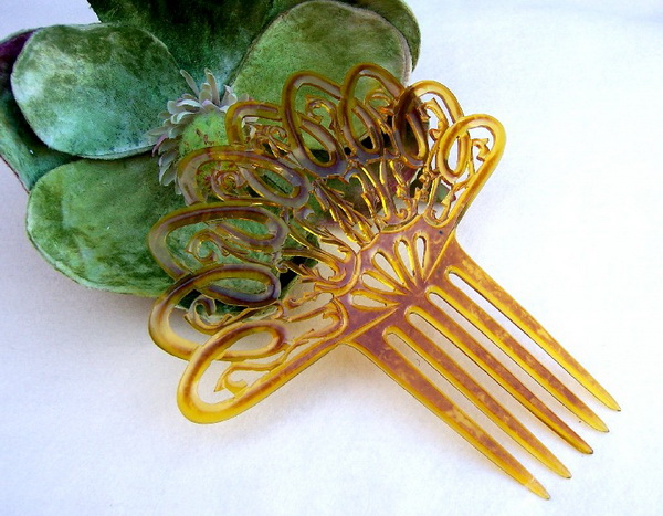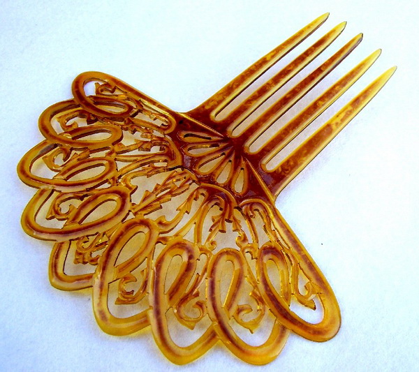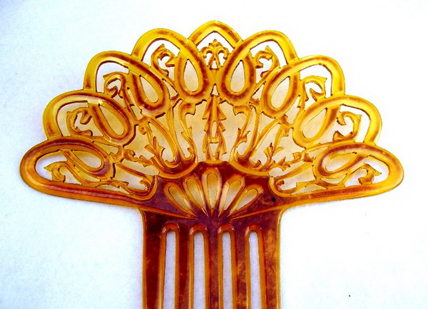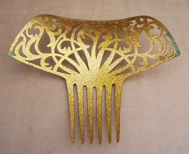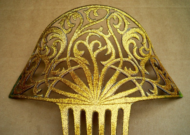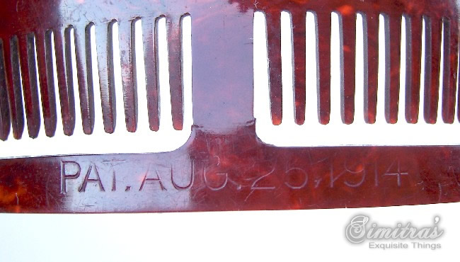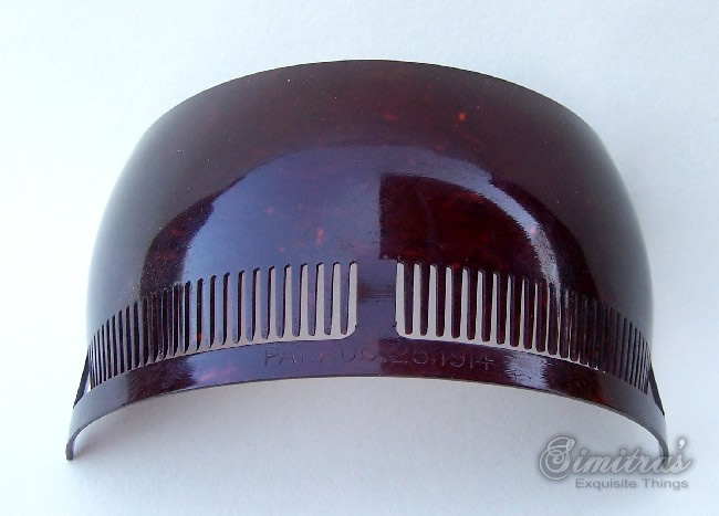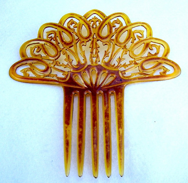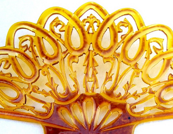 In this case the openwork design on the heading has been made with tiny gold metallic fragments which are suspended in the plastic. Combs like this seem to have originated in the USA and are generally known as “glitter” or sometimes “goldstone” effect combs, in imitation of the mineral known as goldstone which has glittering iron pyrites in it. Trade names for such effects were Tinseloid, Goldstone or Goldaleur.