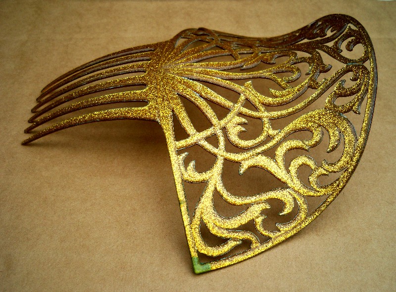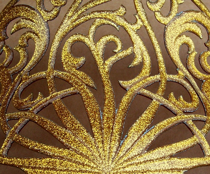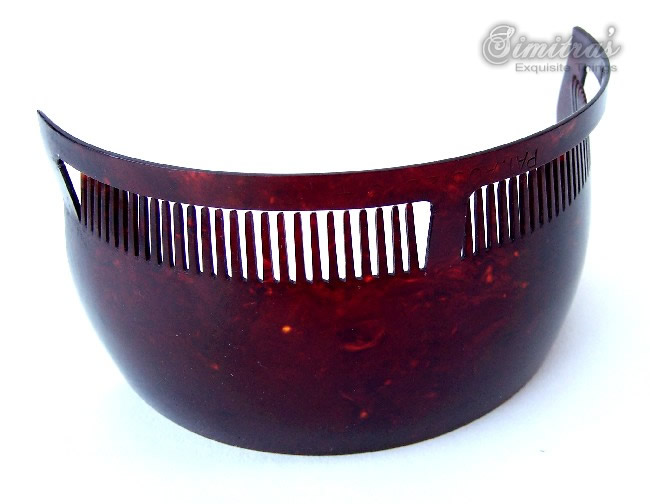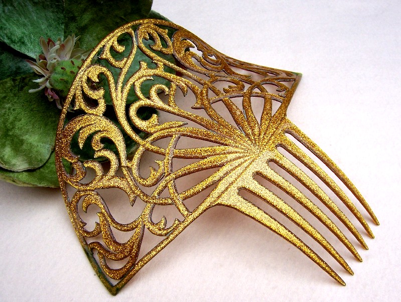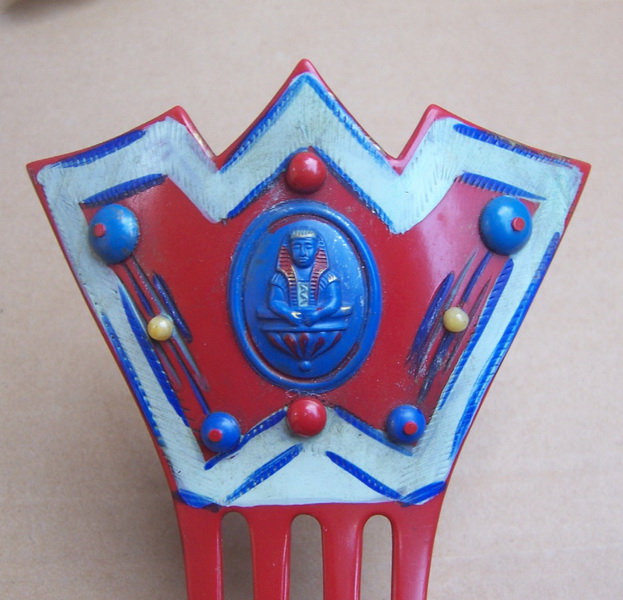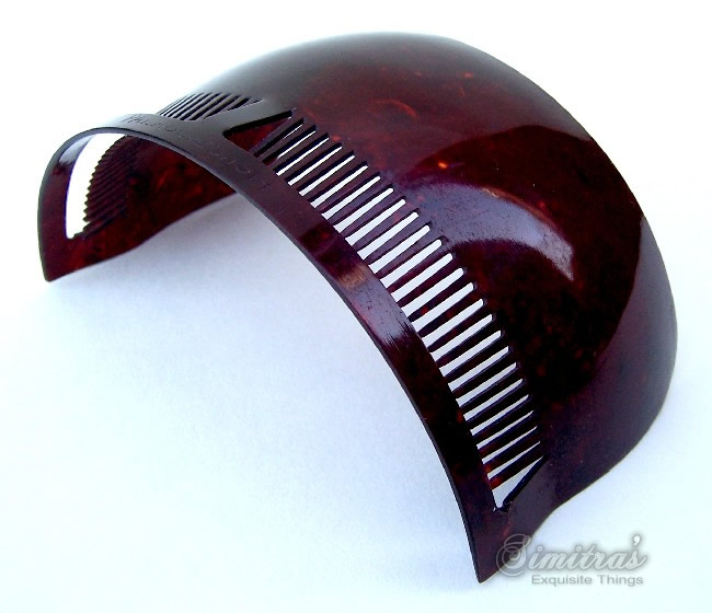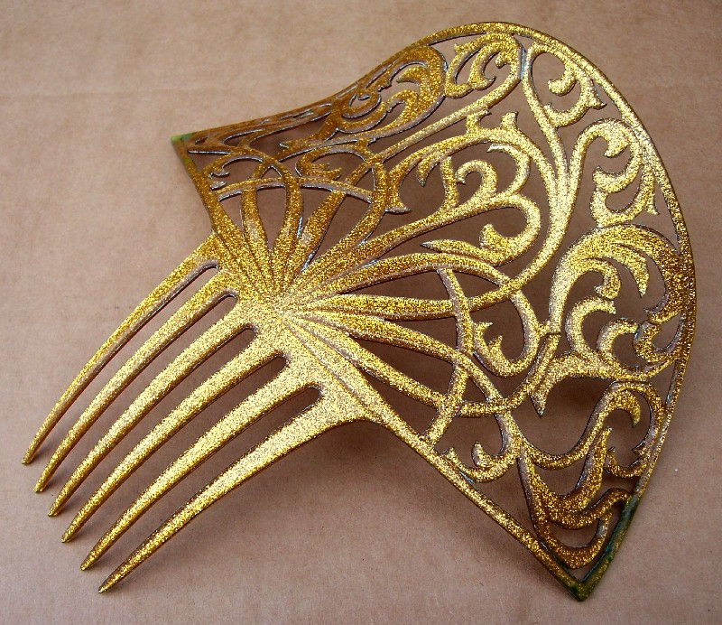 In this case the openwork design on the heading has been made with tiny gold metallic fragments which are suspended in the plastic. Combs like this seem to have originated in the USA and are generally known as “glitter” or sometimes “goldstone” effect combs, in imitation of the mineral known as goldstone which has glittering iron pyrites in it. Trade names for such effects were Tinseloid, Goldstone or Goldaleur.
