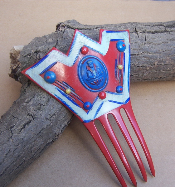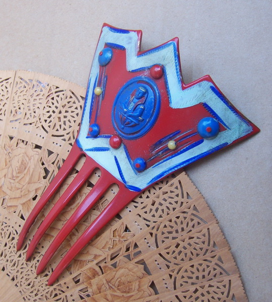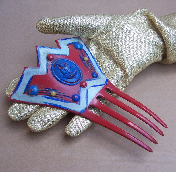 This very beautiful and unusually large comb is probably made from one of the newer synthetics, either Catalin or Lucite, which allowed a number of exotic decorative effects. Lucite is the queen of diversity, appearing in many forms, colours and styles in jewelry. The variety called confetti Lucite encompasses a wide range of variations, all basically a transparent form of Lucite with chips or glitter resembling metallics or mother of pearl or even rhinestones encased so that they appear to float in the material.