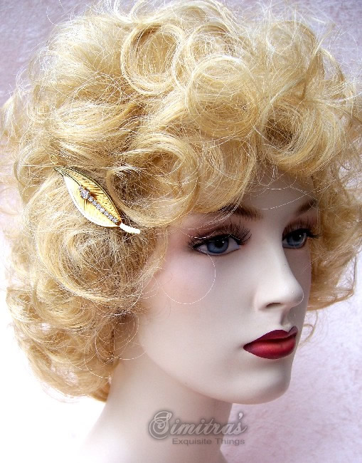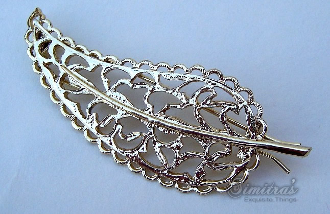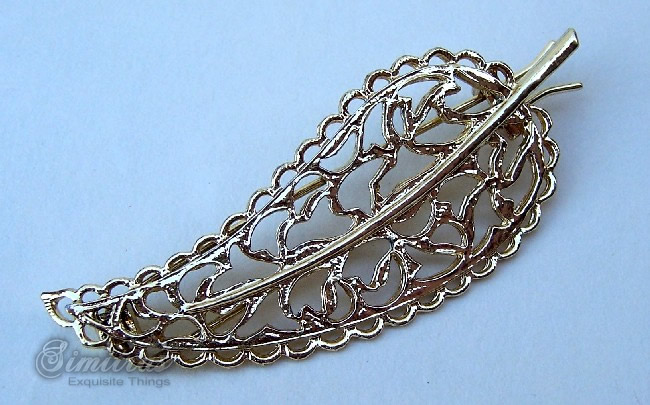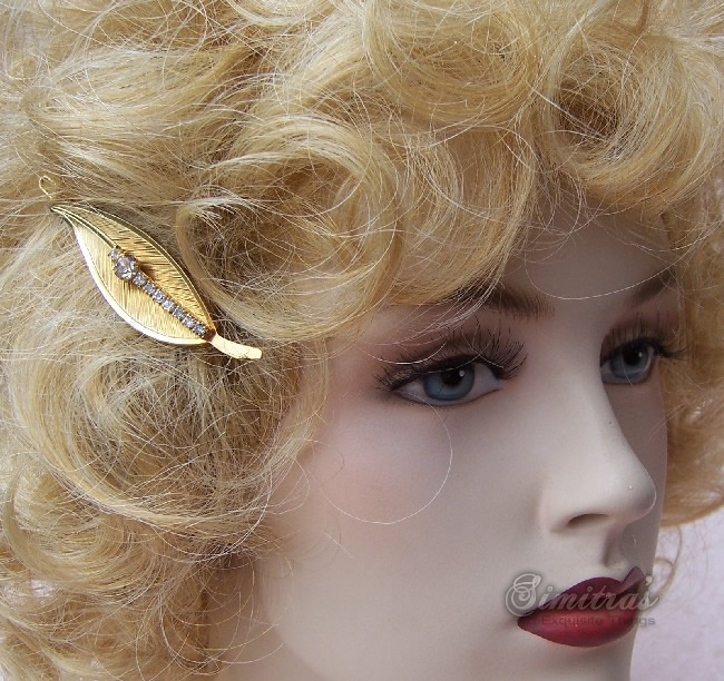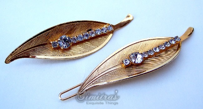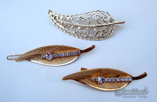 This is a complete wardrobe of three vintage hair barrettes probably dating from the period 1950s to 1960s. They comprise a matched pair and one single. All three are very similar in appearance, being made from goldtone metal and featuring a leaf shape. This was one of the iconic motifs in jewellery of the period.